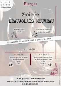 ♦ Vendredi 21 novembre 2025 : Soirée Beaujolais nouveau organisée par le Comité des Fêtes